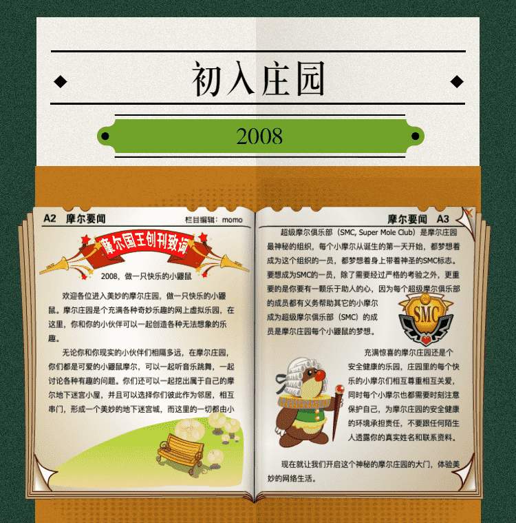 在这一年,,,,摩尔庄园诞生了。。。。在这里,,,大家都是可爱的红鼻子鼹鼠小摩尔,,,,可以一起勤劳耕作,,一起高山滑雪......我们都是摩尔庄园的建设者。。。