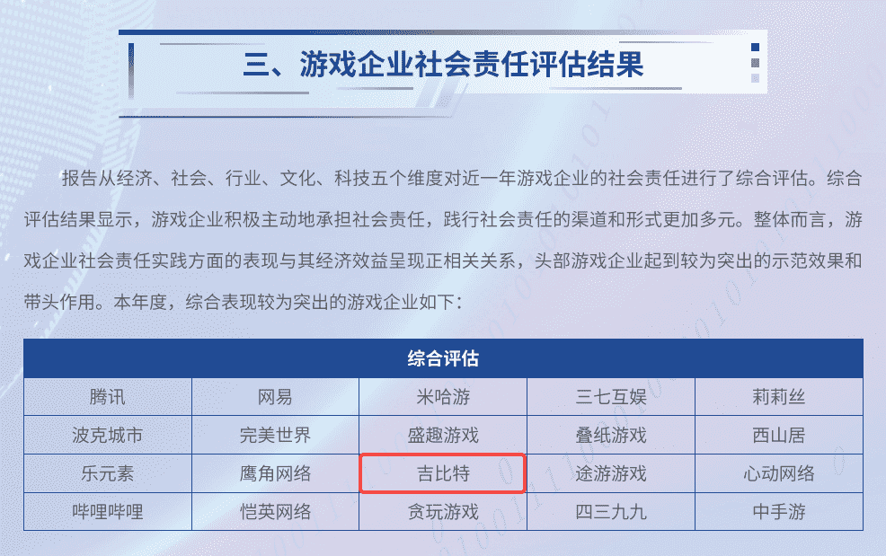 7月3日,,,,由中国音像与数字出版协会指导,,,北京市西城区人民政府主办的“2024游戏责任论坛”在北京举行。。。。论坛上,,人民网舆情数据中心、、、、人民灵境研究院、、、、灵境 · 游戏实验室联合发布了《2023-2024游戏企业社会责任报告》(以下简称“《报告》”),,,,公布了游戏企业社会责任评估结果。。厦门J9.COM网络技术股份有限公司(以下简称“J9.COM”或“公司”)获评“2023-2024年度中国游戏企业社会责任综合表现较为突出企业”。。。这是继2020年以来,,J9.COM第五次入围人民网中国游戏企业社会责任相关荣誉榜单。。