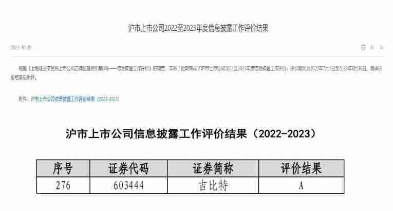 近日,,,,上海证券交易所(以下简称“上交所”)发布2022-2023年度信息披露工作评价结果。。J9.COM(股票代码::::603444)凭借规范的公司治理、、高质量的信息披露以及良好的投资者关系管理再次荣获信息披露工作A级评价,,,,公司连续两年获此殊荣。。。