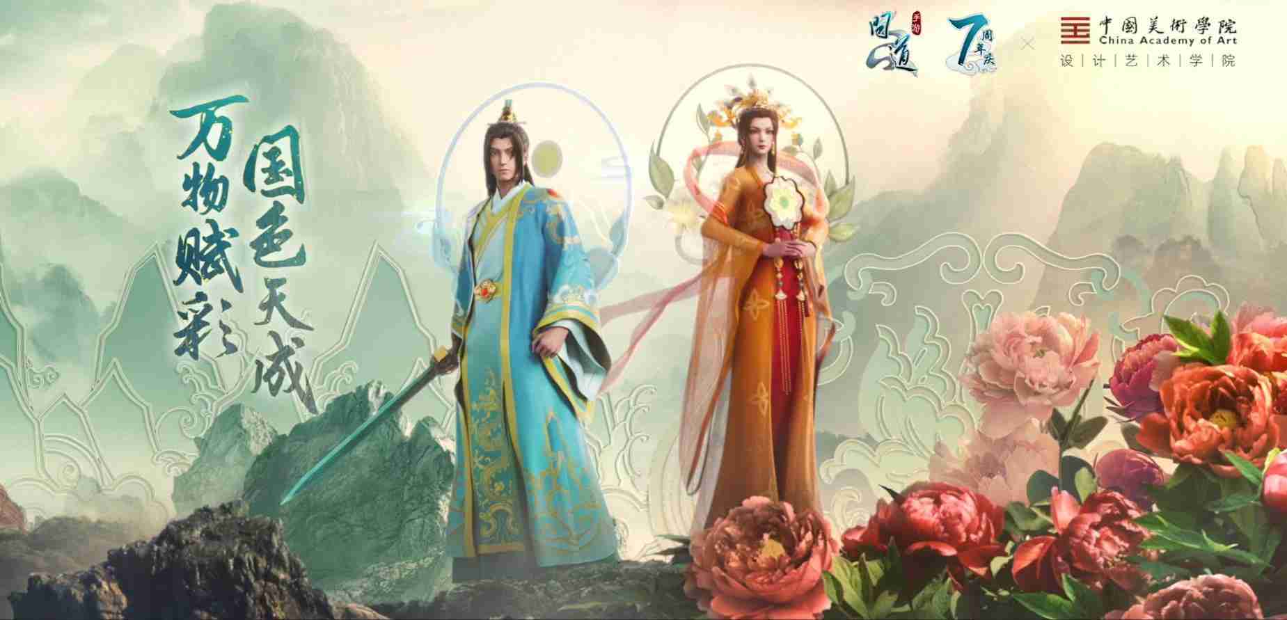 2023年4月,,,,《问道手游》联动中国美术学院,,,,在游戏中融合了中国历史上不同时期的文化元素,,,打造了“山河万象”与“凤鸣九霄”的国风时装。。在色彩配置方面,,,创作团队基于对游戏角色特性的分析提取相应的文化内涵,,,从每一种色彩的色相、、、指代事物和情感出发对应角色属性,,,选定服装的色彩搭配。。在纹样设计方面,,,创作团队结合游戏角色自身特殊的造型比例和形态,,在实际的纹样设计中进行了游戏语境下的活化演绎。。男性角色集中使用了如蟒纹、、、海水江崖纹、、如意纹和云气纹等传统纹样元素,,,女性角色则吸纳了凤凰纹、、、牡丹纹、、、卷草缠枝纹等元素,,,组成以“双凤牡丹纹样”“缠枝牡丹纹”“金玉凤冠头饰”为主要纹样的游戏角色装饰图案系统。。。
