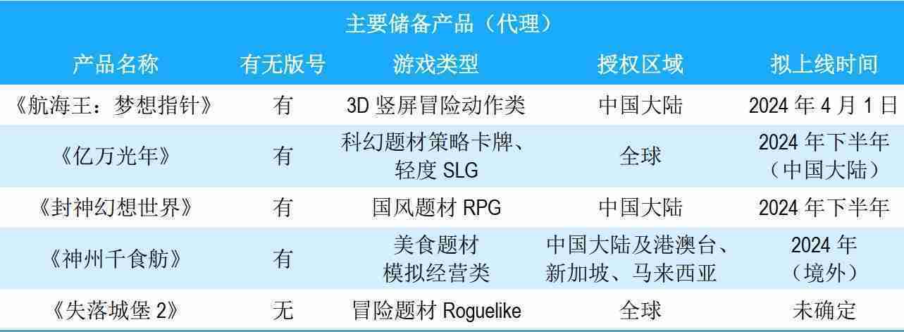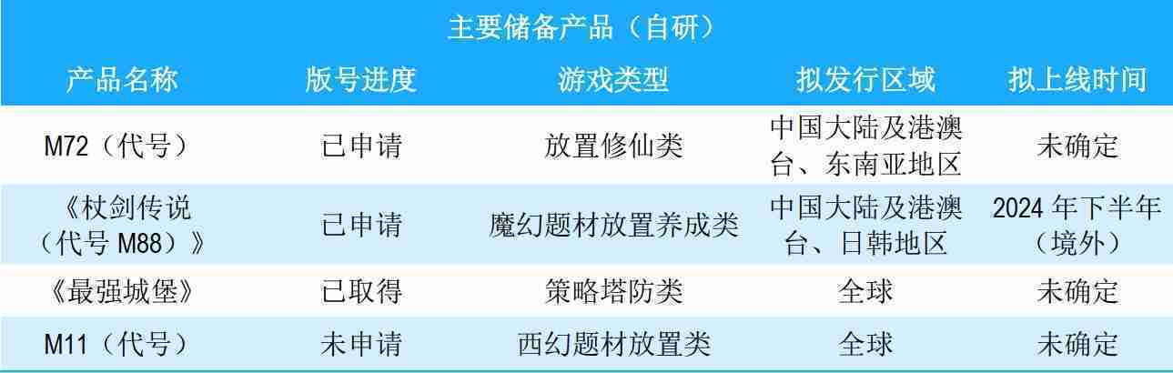 公司储备的多个自研、、代理产品都在有序推进当中,,涵盖放置类、、、策略类、、、、模拟经营类、、、、RPG、、、、Roguelike等多元化游戏品类,,,储备的主要自研和代理产品如下:::