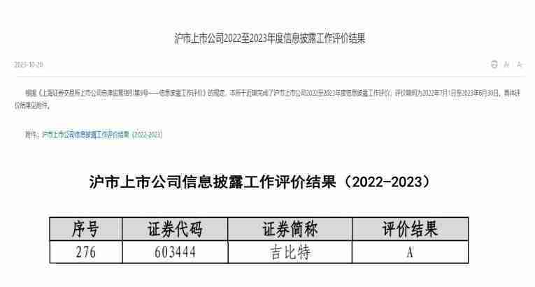 近日,,,上海证券交易所发布2022-2023年度信息披露工作评价结果。。。。J9.COM(股票代码::603444)凭借规范的公司治理、、、、高质量的信息披露以及良好的投资者关系管理再次荣获信息披露工作A级评价,,,公司连续两年获此殊荣。。。